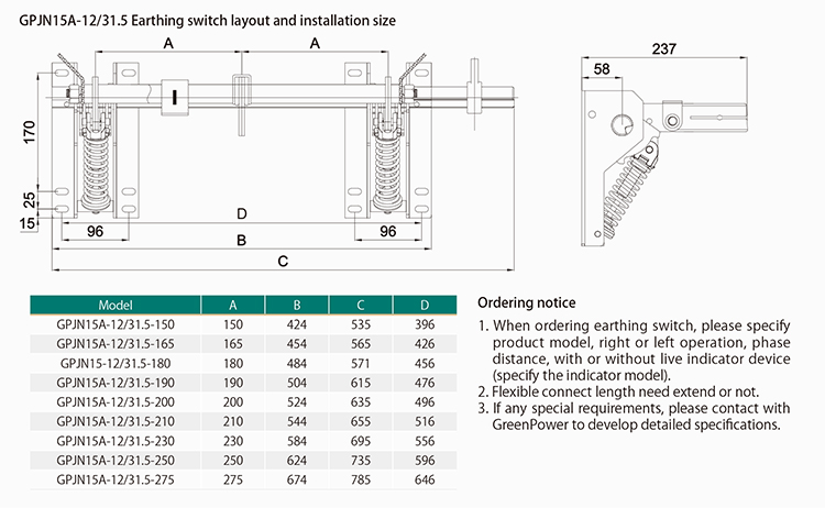 When ordering earthing switch, shall specify products model, rated voltage, phase distance, thermal stability current, with or without live indicator device. (If necessary, please specify the monitor model).